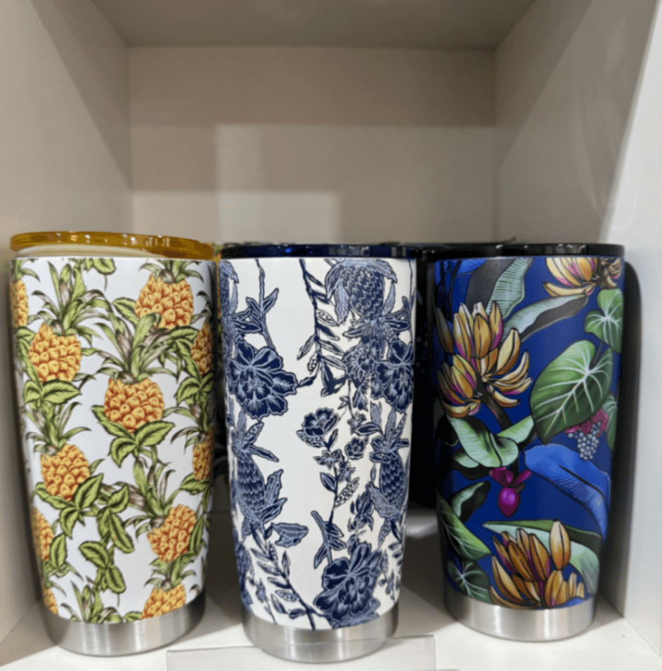 Conjunto com 3 canecas térmicas de viagem, em aço inox com isolamento a vácuo de parede dupla. Mantêm bebidas quentes por horas e frias por muito tempo, mantendo o sabor original. Tampas com vedação segura e bico ergonômico para beber com praticidade. Estampas tropicais: abacaxis, flores azuis e folhas vibrantes, únicas e modernas. Perfeitas para trabalho, viagens, academia ou passeios ao ar livre.